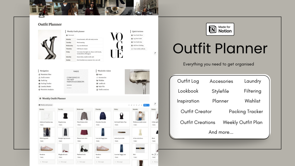 A thoughtfully designed Notion template to help you build your dream wardrobe, plan outfits with ease, and confidently express your personal style. From daily outfits to special occasion looks, this digital planner keeps your closet organised and your style intentional.