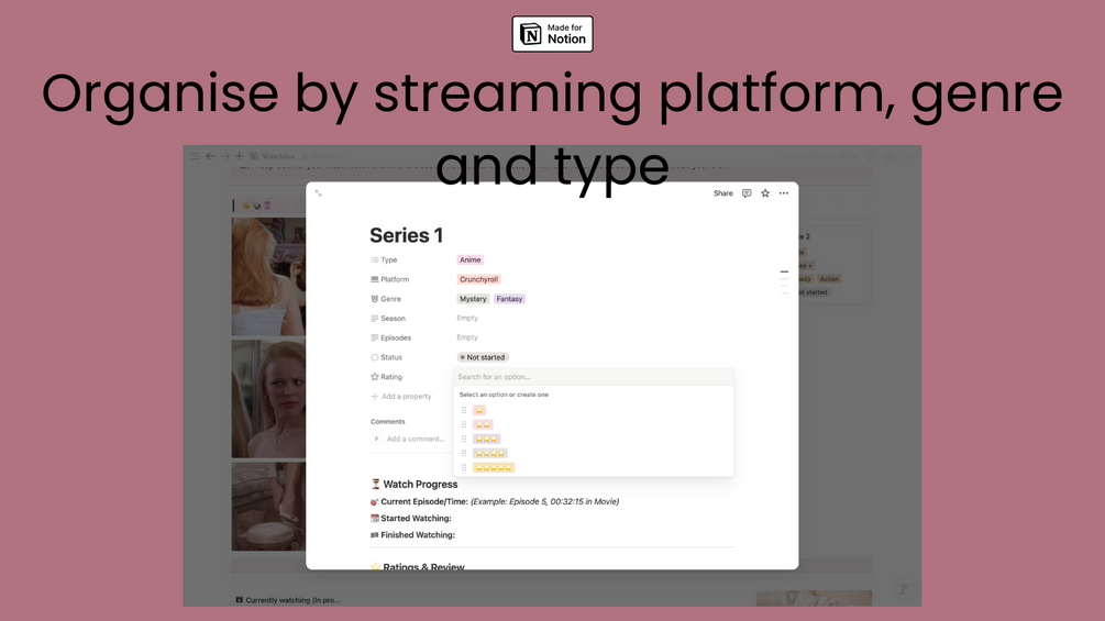 A clean and customisable Notion template for tracking your favourite shows, movies, documentaries, anime, and everything in between. Whether you're planning your next binge or rating your recent watches, this template keeps your entire entertainment list neatly sorted.