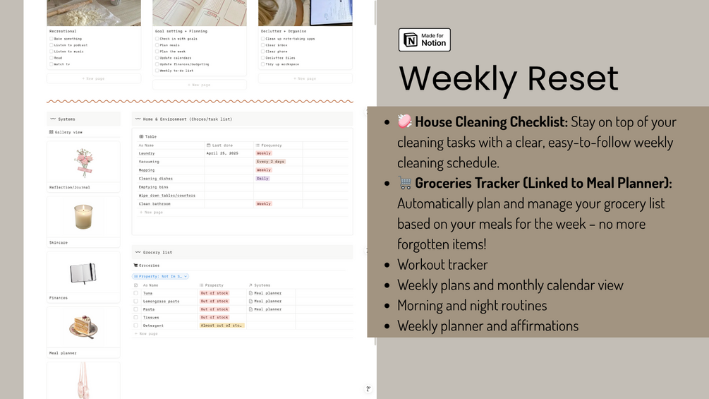 This Notion template includes everything you need to reset your space, your mind, and your schedule – all in one place. Whether you're a student, creator, or just someone who loves a good Sunday reset, this is for you!
