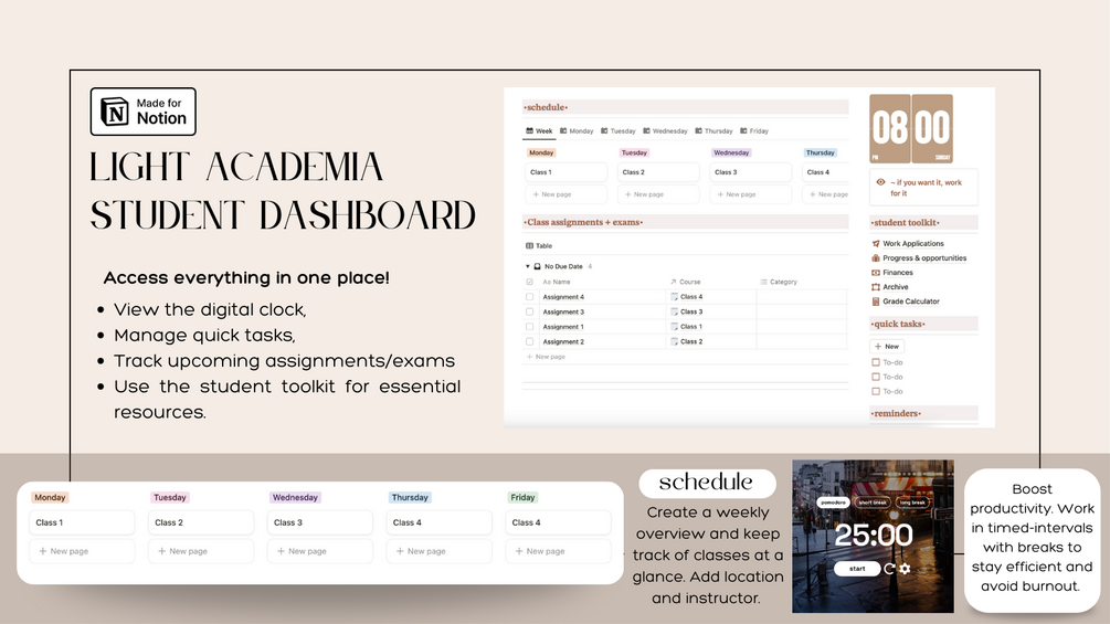 The Light Academia Notion Student Dashboard Template is the perfect all-in-one planner for the year ahead. Featuring a minimalist and aesthetic design, this student dashboard helps you stay organized with ease—whether it’s assignments, exams, or school activities. With its intuitive layout and user-friendly features, this template is ideal for students looking to streamline their academic life and stay on top of their studies in style.
