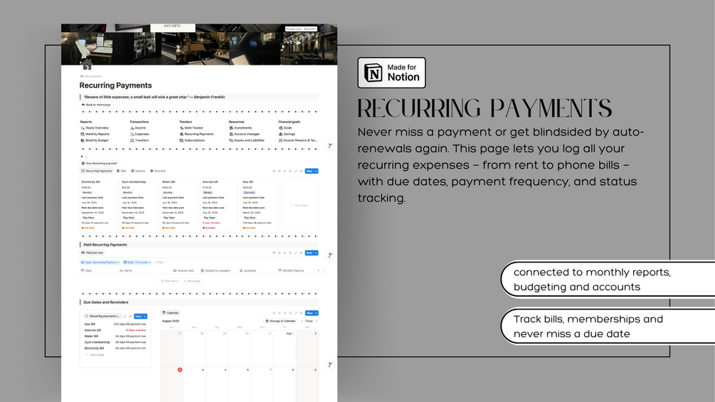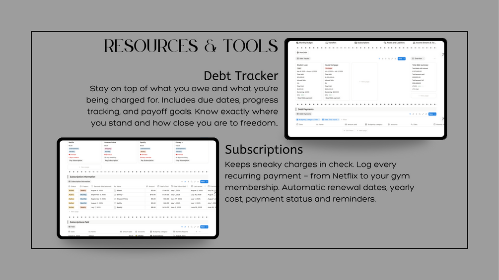 A powerful, all-in-one Notion system designed to give you total control over your finances. From budgeting and saving to investments and debt payoff, every feature is crafted to help you stay organised, motivated, and on track toward financial freedom.