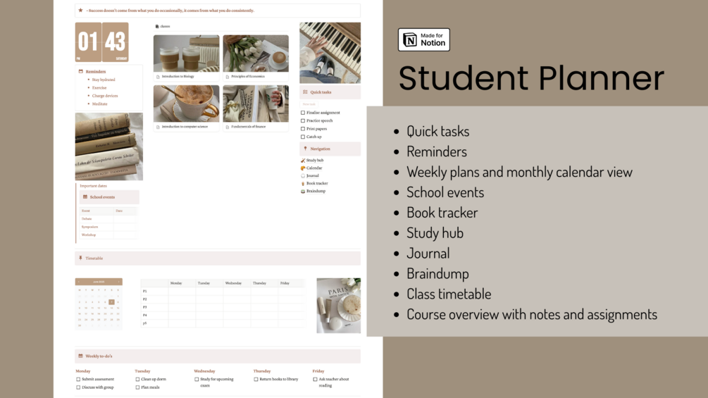 Stay organised and motivated with this free student planner template – perfect for high school or university students! It includes everything you need to stay on track with classes, assignments, notes, and your weekly schedule, all in a clean and functional Notion layout.