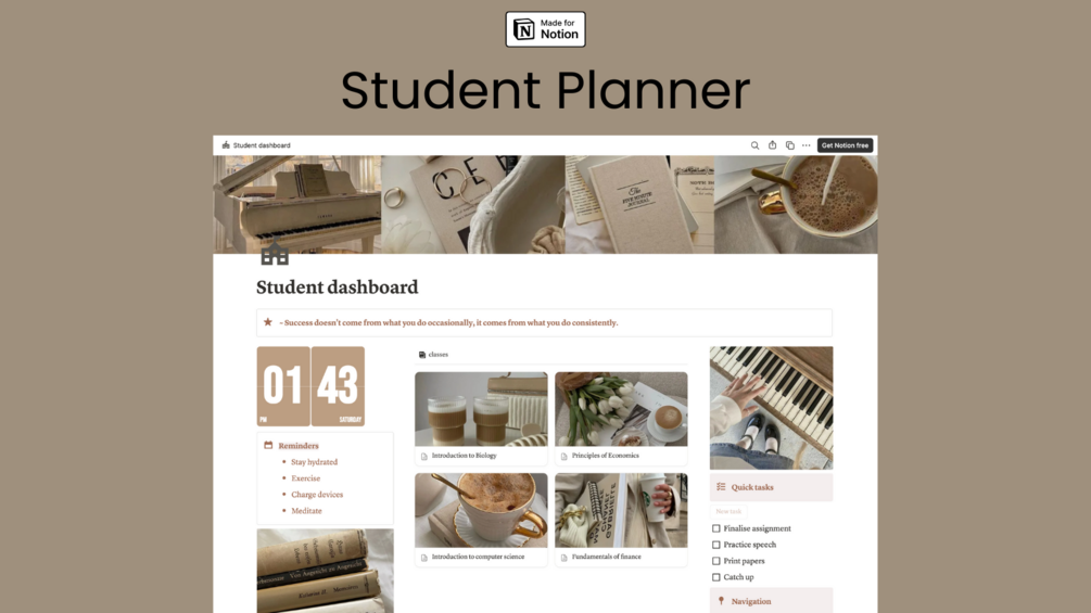 Stay organised and motivated with this free student planner template – perfect for high school or university students! It includes everything you need to stay on track with classes, assignments, notes, and your weekly schedule, all in a clean and functional Notion layout.